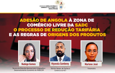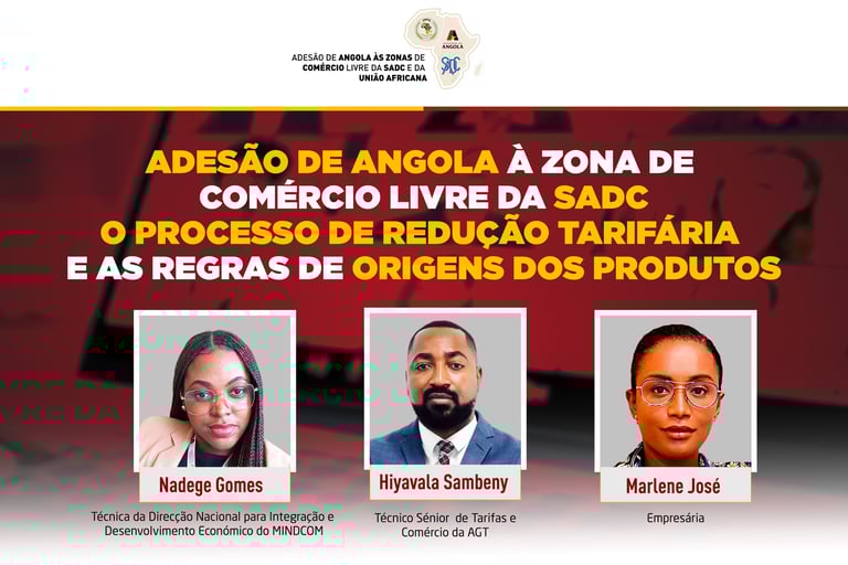 O encontro, realizado às 10 horas e transmitido online, contou com a participação de Hiyavala Sambeny, Técnico Sénior de Tarifas e Comércio da Administração Geral Tributária (AGT); Nadege Gomes, Técnica da Direcção Nacional para Integração e Desenvolvimento Económico do MINDCOM; e Marlene José, empresária e representante da FOODCARE.